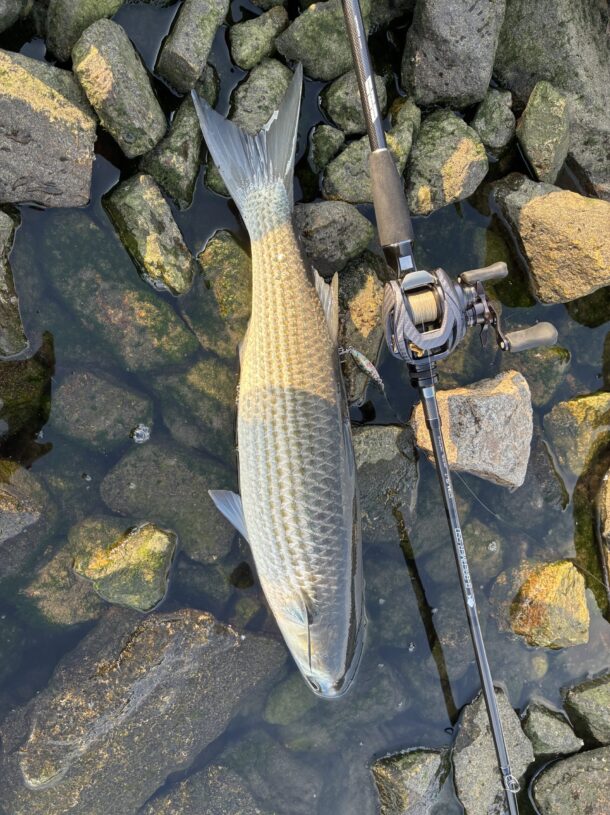 ボラのスレがかりは意味わからんぐらい強烈な引きでドラグでっぱなしで走り続ける…もう嫌って感じでスプールを押さえてなんとかポンプリトリーブで徐々に寄せてきて岸へ引きずり上げた…とてもつかれた…。