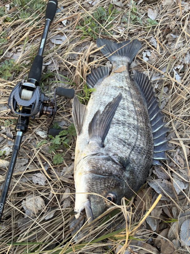 とにかく最高にパワフルな引き。久々にこんなパワフルなチヌの引きを味わうわ(引きの強さはボラの方が上だったかも知れないが)と思いながらやり取りをするがマジで意味わからんぐらい走ってこれはヤバい…切られる…と感じて走り回りなんとか寄せてゲット…。久々にチヌにライン切られるかと思った。